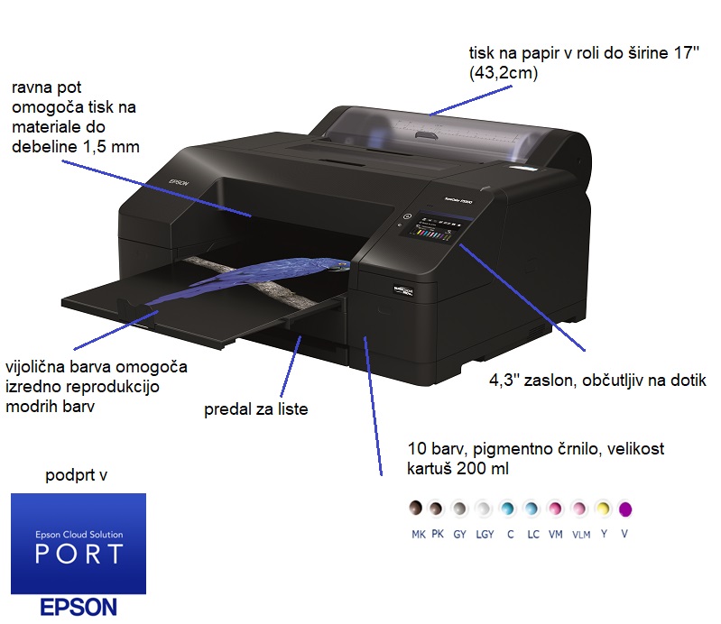 - Črnila: Epson UltraChrome PRO 10 pigmentna črnila na vodni osnovi, velik barvni obseg; 200 ml kartuše; ob nakupu pridejo s tiskalnikom 80 ml kartuše;
