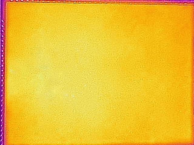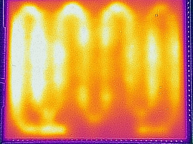 Slika 1: Na termo kameri se lepo vidi grelni element v začetku segrevanja. Lepo se vidi, da ima tudi 40x50cm preša samo en grelni element, in ne more priti do delnega segrevanja plošče.