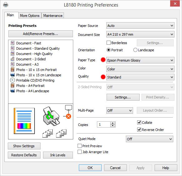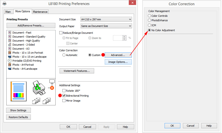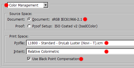 Z rdečo piko so označene pomembne nastavitve za barvno točen izpis. Ne pozabite izbrati pravilno velikost papirja. Za višjo ločljivost izberite 'High' namesto 'Standard'. Za Sijajne papirje izberite 'Epson Premium Glossy' za polsijajne (semimat, satin, pearl, ...) izberite 'Epson Premium Semigloss'.