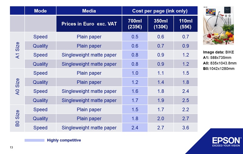 Epson navaja: strošek črnila pri tisku slike s kolesom (BIKE) na različne papirje in pri različnih nastavitvah tiskanja prikazuje spodnja tabela. Prišteti je potrebno še strošek papirja. Cene so informativne in ne vključujejo DDV.